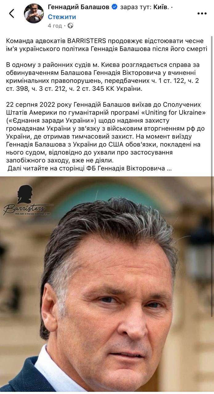 Про це повідомили на сторінці Генадія Балашова зі згадкою, якщо не рекламою, адвокатської фірми «BARRISTERS», яка його представляє.