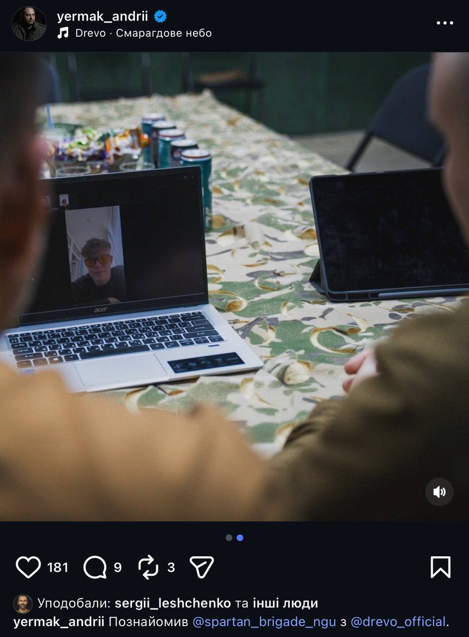 Виглядає так, що у Андрія Єрмака закінчилися інфоприводи, тому він розповідає як познайомив військових (а точніше лише одного) з виконавцем «Смарагдового неба», співаком Drevo