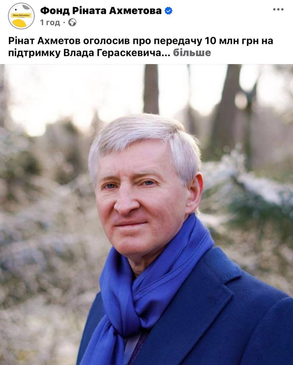 Аби повідомити про це, в дописі використали дуже задумливе «патріотичне» фото самого Ахметова замість, скажімо, фото Владислава Гераскевича