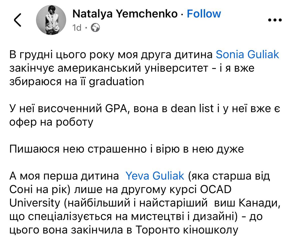 Багаторічна піарниця Ахметова Наталія Ємченко, як і дипломат Пристайко, не бачить майбутнього для своїх дітей в Україні і відверто хизується тим, що вони вчаться не в українських вишах Молодші ж доньки разом із чоловіком Ємченко проживають у Німеччині.