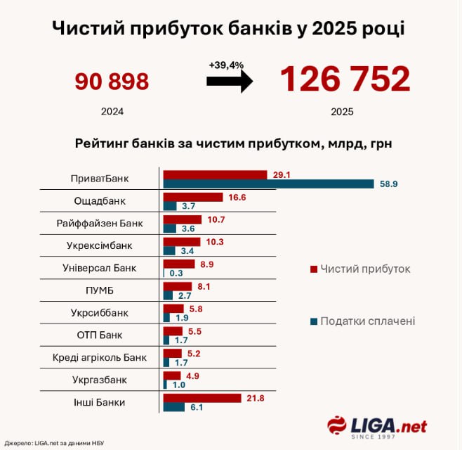 За даними НБУ, чистий прибуток банківської системи за підсумками 2025 року становив 126,7 млрд грн. Порівняно з 2024 роком показник зріс на 39,4%.