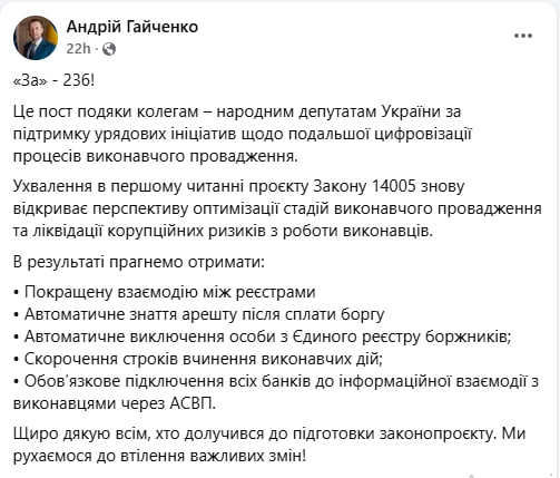 ️Банки зобов’яжуть підключитися до системи виконавців: у них буде 6 місяців в разі ухвалення законопроекту №14005 про про цифровізацію виконавчого провадження та автоматичне блокування майна Контрверсійний законопроект №14005, який Верховна Рада ухвалила 4 листопада за основу, передбачає обов’язкове підключення банків, небанківських установ і емітентів електронних грошей до автоматизованої системи виконавчого провадження (АСВП). До моменту підключення обмін інформацією між фінансовими установами та виконавцями здійснюватиметься у паперовій формі. Після цифрової інтеграції обмін відбуватиметься автоматично через АСВП у режимі реального часу. Заступник міністра юстиції Андрій Гайченко наголосив, що остаточне прийняття законопроекту відкриває “перспективу оптимізації стадій виконавчого провадження та ліквідації корупційних ризиків з роботи виконавців”.