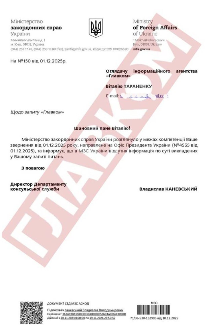 ️️Міністерство закордонних справ заявило, що не має запитуваних даних. У відповіді на запит видання зазначено, що МЗС “не володіє запитуваною інформацією” щодо громадянства Міндіча та Цукермана.