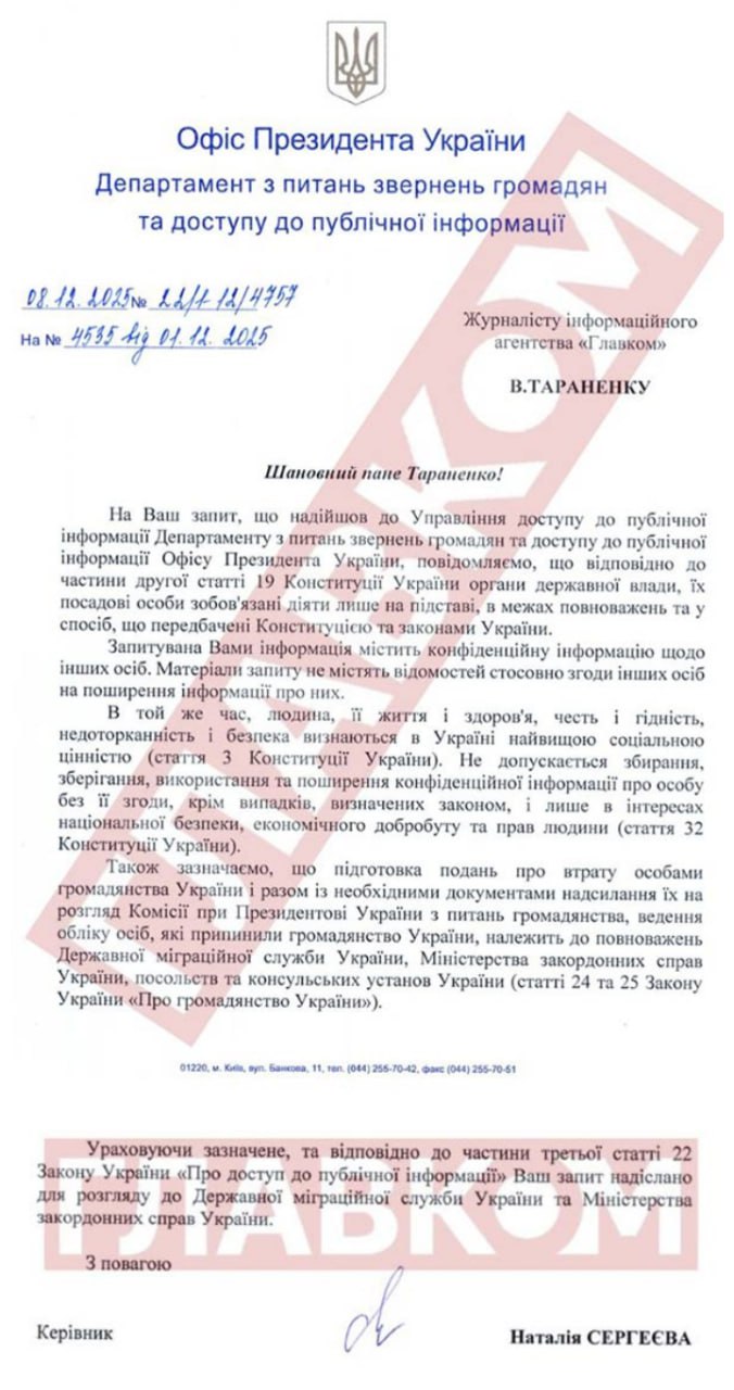 Офіс президента повідомив на запит Главкома, що інформація про припинення, позбавлення або втрату громадянства є конфіденційною. “Запитувана вами інформація містить конфіденційну інформацію щодо інших осіб”, — зазначила керівниця департаменту ОП Наталія Сергеєва з посиланням на статтю 32 Конституції України.
