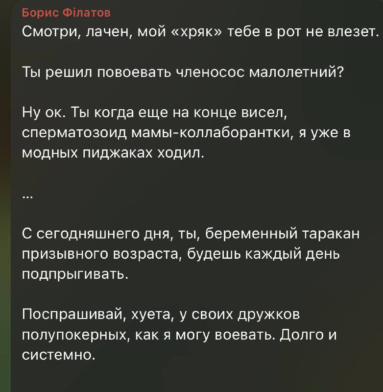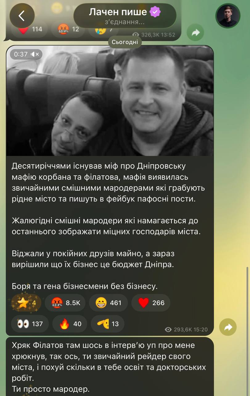 Так, Ігор Лаченков, вочевидь, образився на інтерв’ю Бориса Філатова для «УП», у якому, зокрема, мер Дніпра згадав про блогера, порівнявши його зі скандальною блогеркою Алхім і не менш одіозним Романом «Джокером» Кравцем. Головний посил до Лачена був у тому, аби він пам’ятав, як швидко все можна втратити.