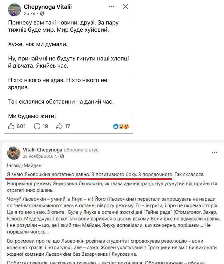 Бондаренко нагадав, що Чепинога заявив про можливий “хуйовий мир” за кілька тижнів і видалив свій допис. Він запитав: “Откуда у него такие инсайды? Ответ очевиден – от его работодателя”. У своєму коментарі Бондаренко припустив, що ця заява може бути інформаційним сигналом від Льовочкіна, написавши: “Зачем Лёпа баламутит народ ртом чёпика? Что-то задумал”.