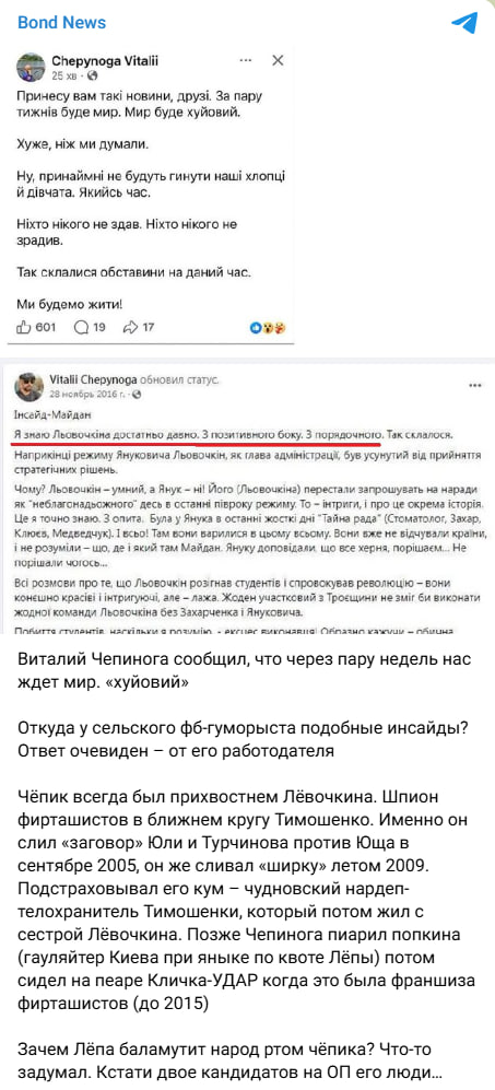 Бондаренко нагадав, що Чепинога заявив про можливий “хуйовий мир” за кілька тижнів і видалив свій допис. Він запитав: “Откуда у него такие инсайды? Ответ очевиден – от его работодателя”. У своєму коментарі Бондаренко припустив, що ця заява може бути інформаційним сигналом від Льовочкіна, написавши: “Зачем Лёпа баламутит народ ртом чёпика? Что-то задумал”.