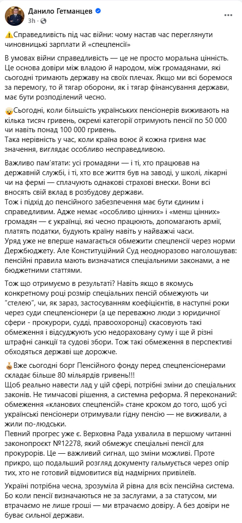 Борг Пенсійного фонду перед спецпенсіонерами-посадовцями перевищив 80 млрд грн — Гетманцев ️ Голова податкового комітету ВРУ Данило Гетманцев заявив, що борг Пенсійного фонду перед спецпенсіонерами складає понад 80 мільярдів гривень. ️ За його словами, йдеться про суддів, прокурорів і правоохоронців, які через суд скасовують обмеження на розмір пенсій, встановлені нормами держбюджету. Навіть якщо в якомусь році розмір спецпенсій обмежують, в наступні роки через суди спецпенсіонери відсуджують усю недораховану суму і ще й штрафні санкції, зазначив Гетманцев.