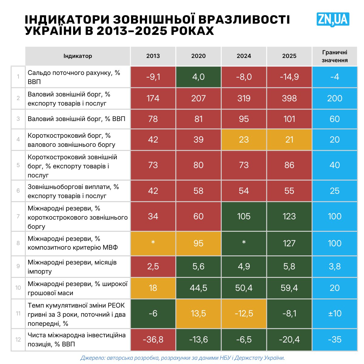 Водночас ZN.UA пише, міжнародні резерви НБУ покривають 5,8 місяця імпорту і перевищують композитний критерій МВФ на 27%, хоча загальний обсяг зовнішніх зобов’язань перевищує резерви у 3,5 раза.