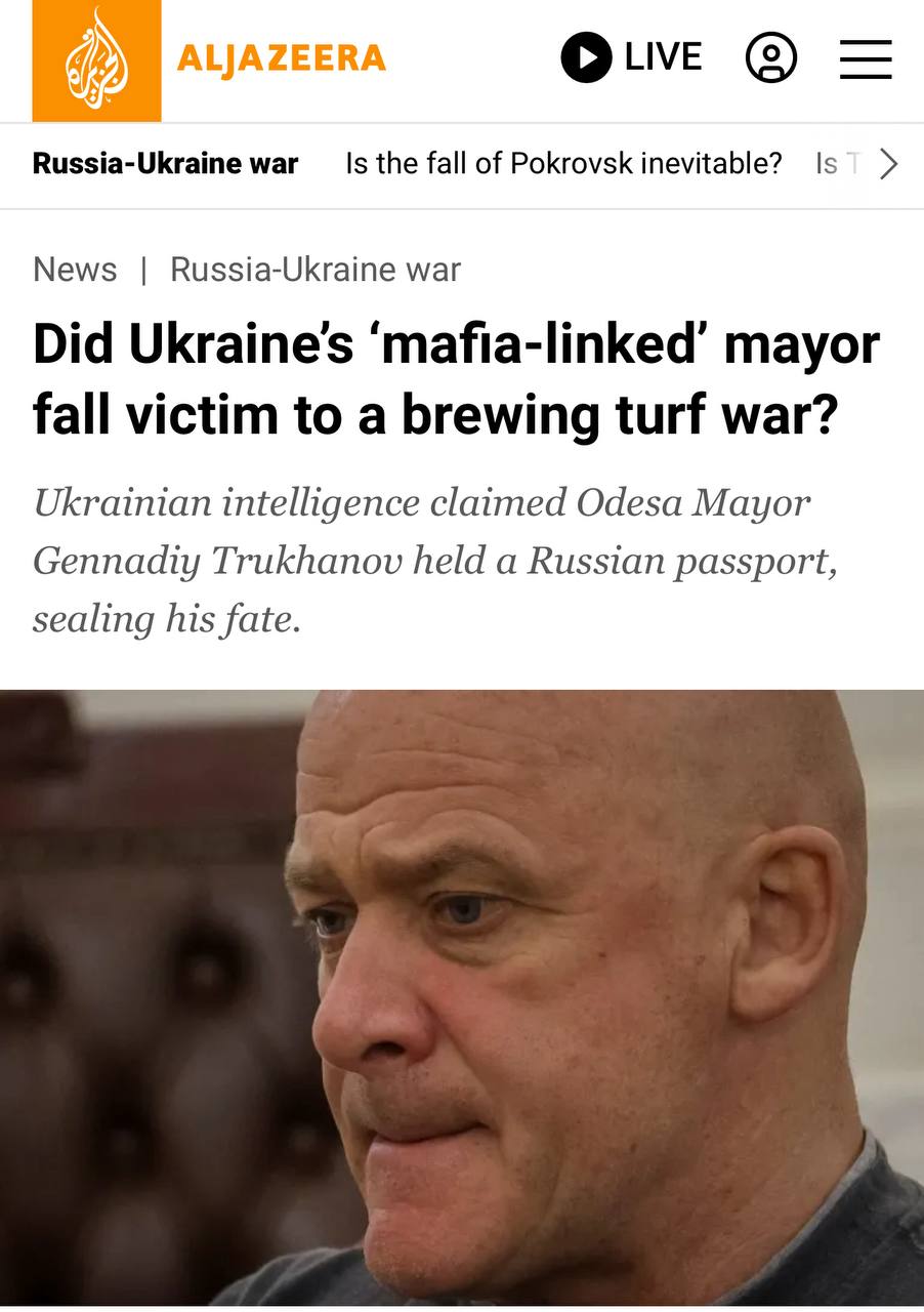 Тим часом Трухановим зацікавилась Аль-Джазіра На сайті відомої катарської телекомпанії вийшла стаття під заголовком «Чи став «пов’язаний з мафією» мер України жертвою назріваючої війни за вплив?» У самій статті говориться про те, що в Україні фактично відбувається негласна боротьба за вплив. Як приклад, наводиться кейс Труханова, а також протистояння ОП з Кличком, крім того туди ж вписали Садового, який також критикував владу. Мовляв, справа Труханова – це показовий випадок для інших, хто вирішить «тягатися» з ОП.