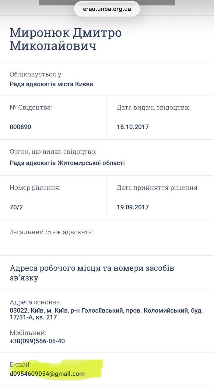 Вирішили ж ми подивитися, а хто ж автор запиту. І встановили, що за цією поштою колись видавалось адвокатьске для такого собі: Миронюка Дмитра Миколайовича.