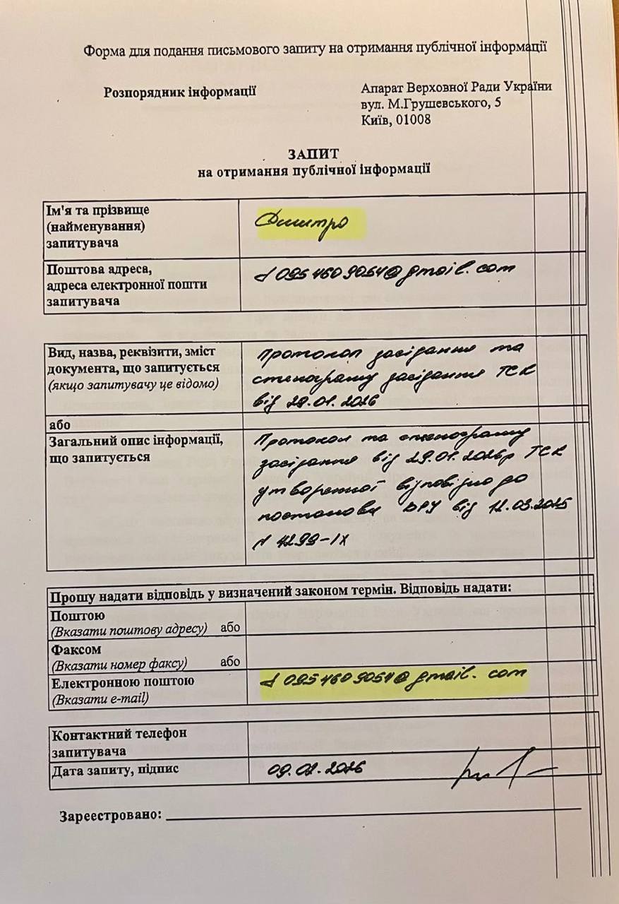 Прийшов значить у Раду анонімний запит на публічну інформацію, щодо протоколу засідання нашої ТСК від 28 січня. Запит від «Дмитра». Ну і пошта вказана куди дати відповідь)