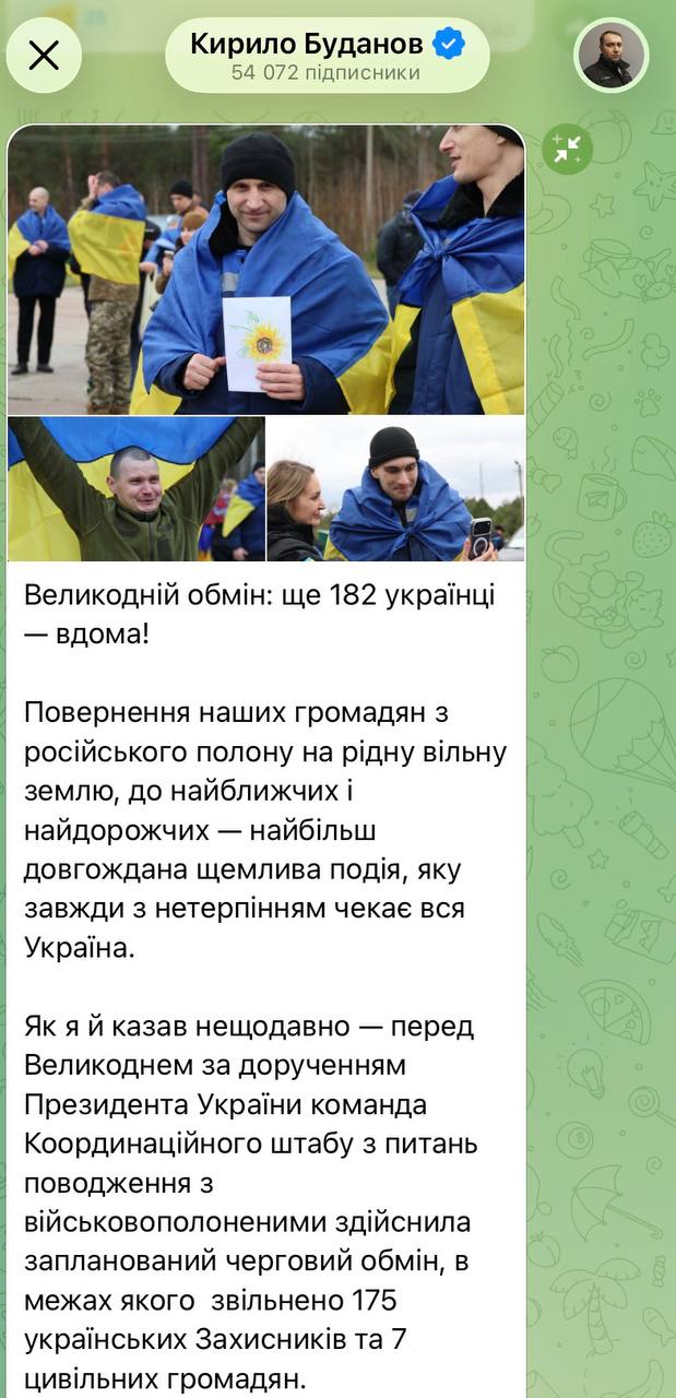 Примітно, що фото з обміну першим виклав голова ОП Буданов. Зазвичай це робить Зеленський, але сьогодні він повідомив цю новину, не дочекавшись фото