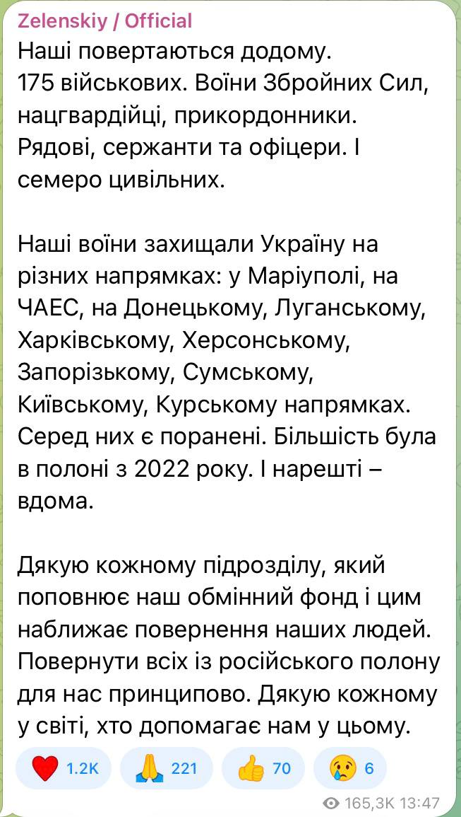 Примітно, що фото з обміну першим виклав голова ОП Буданов. Зазвичай це робить Зеленський, але сьогодні він повідомив цю новину, не дочекавшись фото
