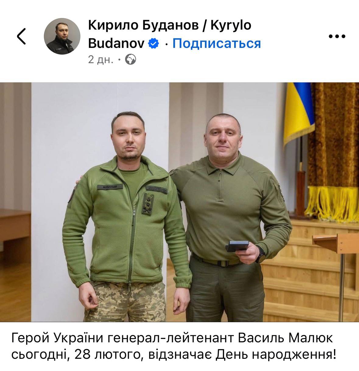 Скріншоти: вітання від Буданова Малюку 28.02.2026 і ігнорування дня народження голови СБУ Малюка Будановим 28.02.2025