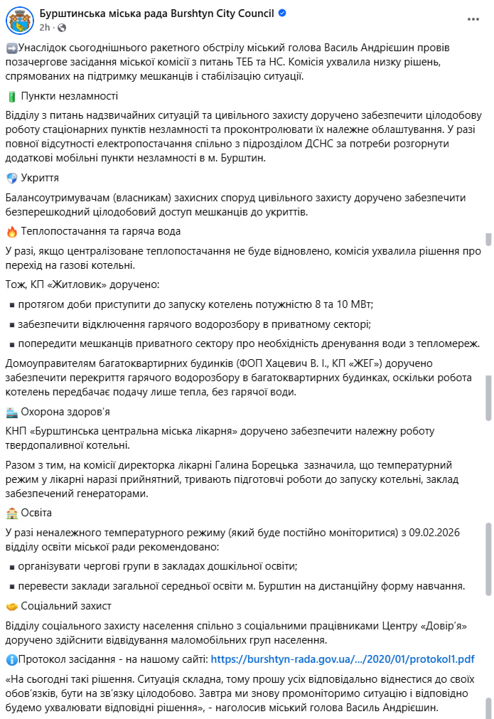 ️У Бурштинській міськраді додали, що після обстрілу відбулося позачергове засідання комісії з питань ТЕБ та НС, ухвалено рішення щодо стабілізації ситуації. КП “Житловик” доручено розпочати запуск газових котелень потужністю 8 та 10 МВт у разі невідновлення централізованого теплопостачання.