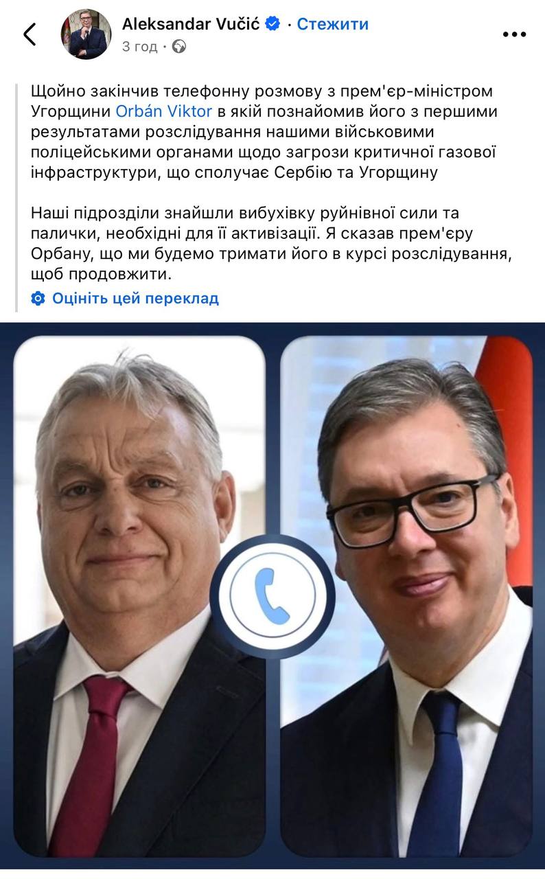 Президент Сербії Александар Вучич заявив, що сербська армія сьогодні знайшла вибухівку біля газопроводу, що з’єднує Сербію з Угорщиною.