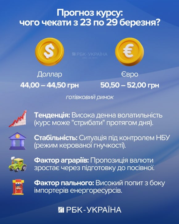 ️Валютний ринок “штормитиме”, але без кризи: долар 44–44,5 грн, євро до 52 грн — прогноз банкіра на 23–29 березня