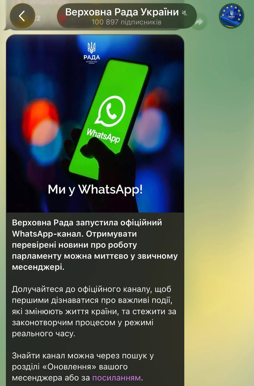Тим часом Верховна Рада завела офіційний WhatsApp-канал на тлі розмов про можливе обмеженням Telegram в Україні