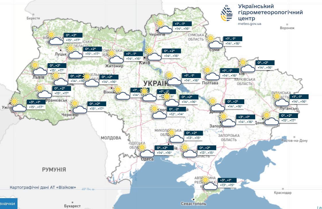 Київщина і Київ: малохмарно, без опадів. Вітер південний 5–10 м/с. Температура по області вночі від +3° до −2°, вдень +12…+17°; у Києві вночі 0–2° тепла, вдень близько +15°.