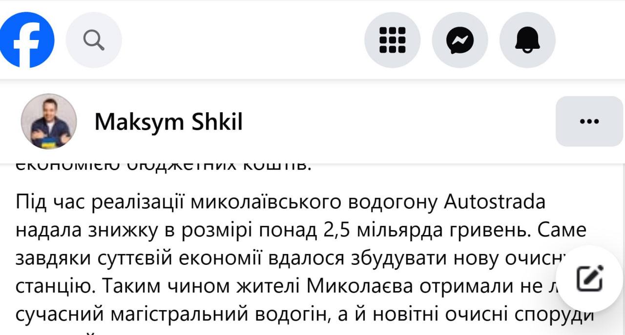 Максим Шкіль написав, що його компанія «Автострада» надала Державі знижку 2,5 млрд на будівництві водогону в Миколаїв