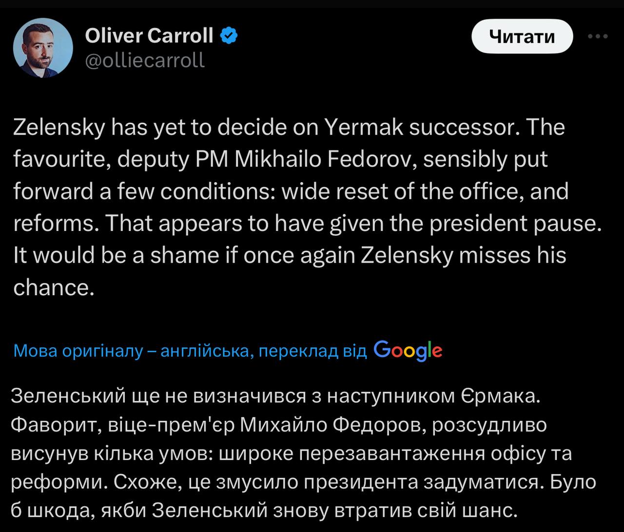 Нагадаємо, раніше Керрол заявив, мовляв, Зеленський ще не визначився з наступником Єрмака, його фаворитом нібито є віце-прем’єр Федоров, але той висунув кілька умов, що змусило президента задуматися.