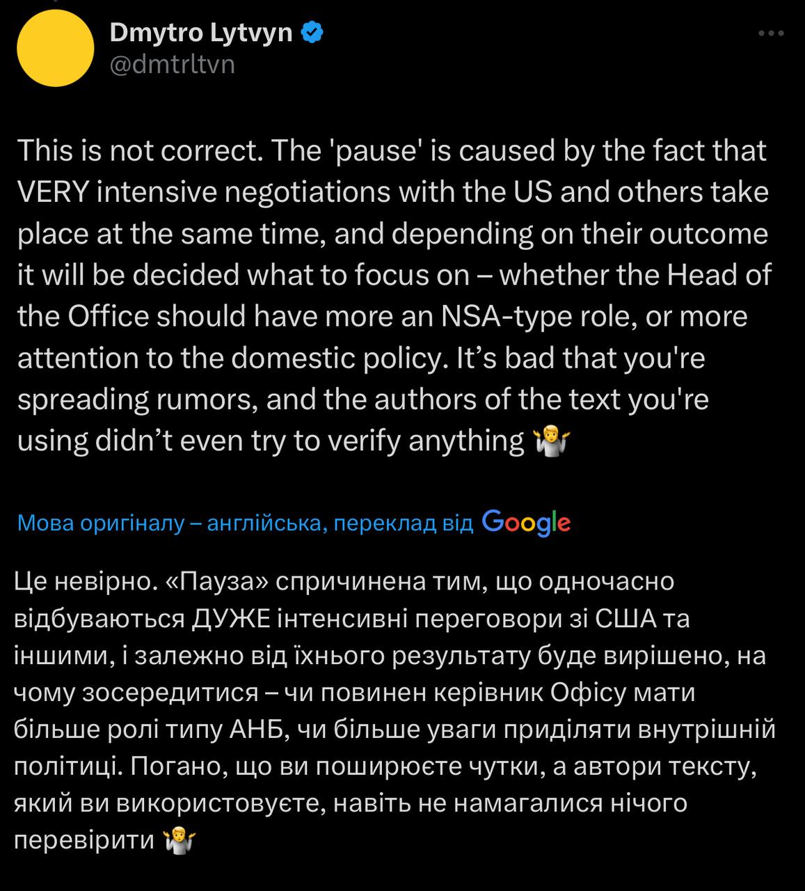 «Пауза» спричинена тим, що одночасно відбуваються ДУЖЕ інтенсивні переговори зі США та іншими, і залежно від їхнього результату буде вирішено, на чому зосередитися – чи повинен керівник Офісу мати більше ролі типу АНБ, чи більше уваги приділяти внутрішній політиці.