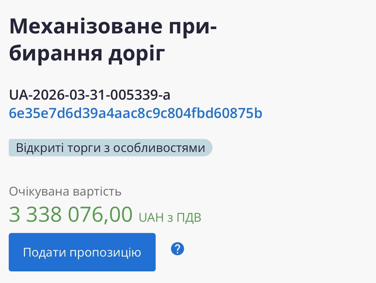 Очікувана вартість закупівлі становить 3 338 076 гривень.