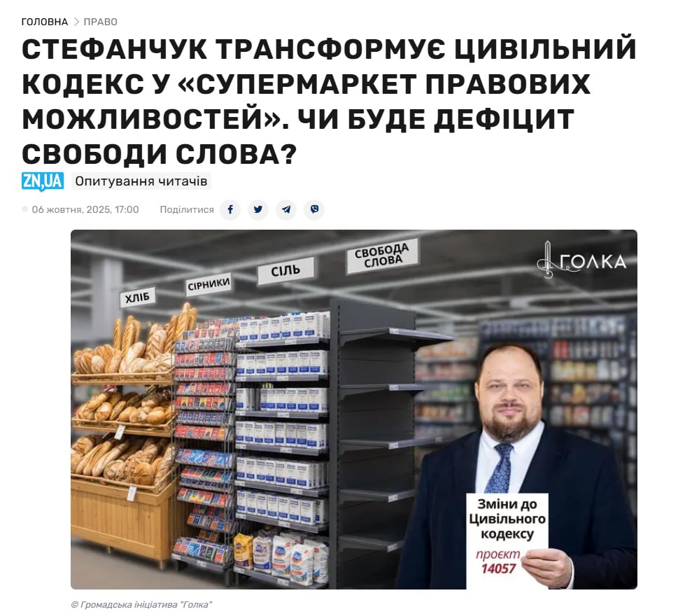 "Голка", яку співфінансує Льовочкін, знову атакує Стефанчука: нова стаття на ZN про "супермаркет правових можливостей", в якій звинувачують його у спробі обмежити свободу слова