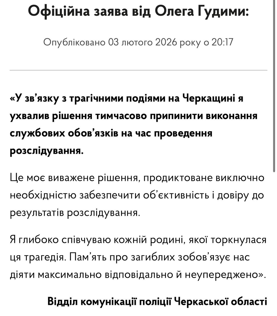 У зв’язку з трагічними подіями на Черкащині я ухвалив рішення тимчасово припинити виконання службових обов’язків на час проведення розслідування. Це моє виважене рішення, продиктоване виключно необхідністю забезпечити об’єктивність і довіру до результатів розслідування.