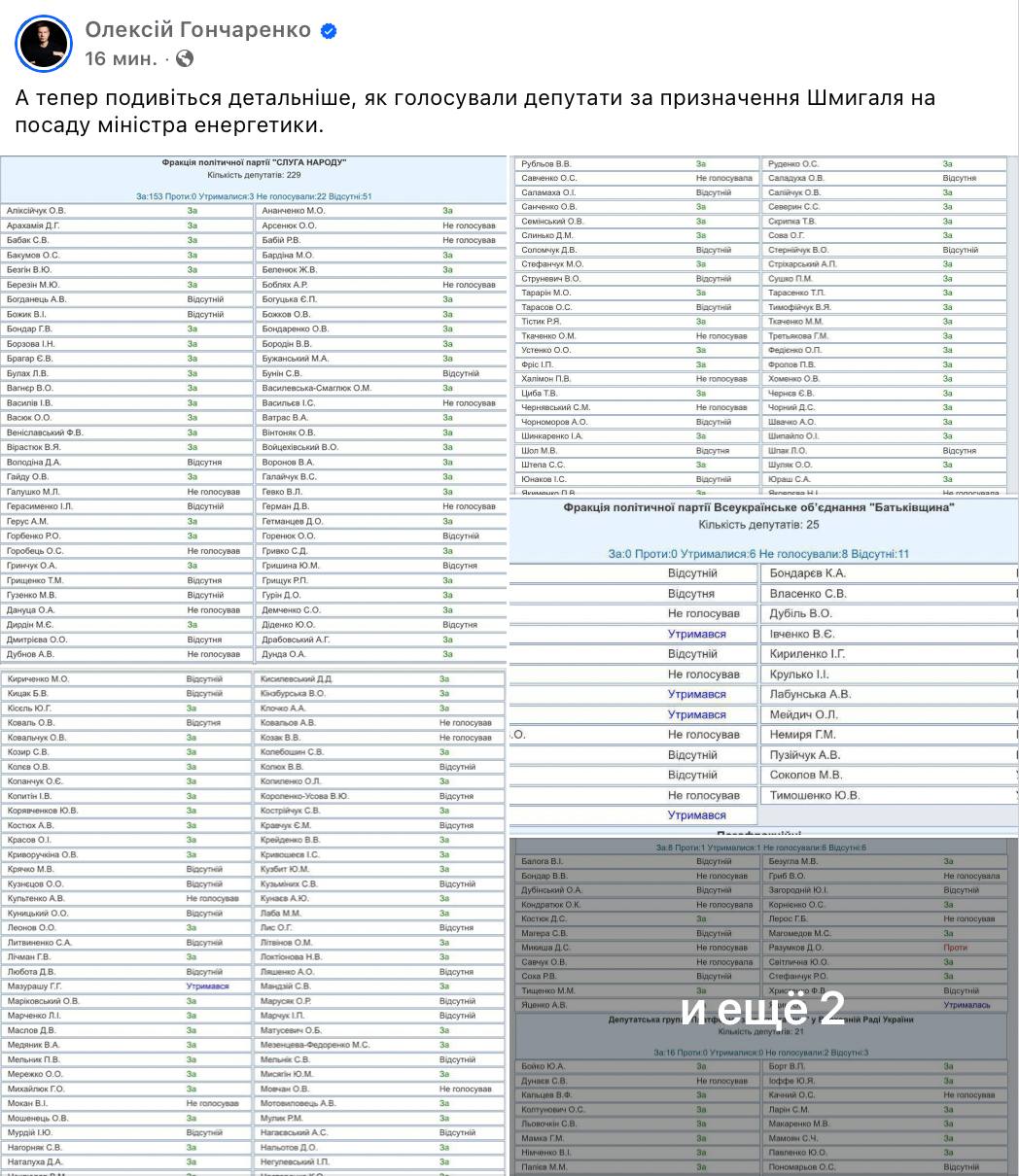 Нардеп Гончаренко опублікував списки голосування, аби звернути увагу людей хто саме з нардепів провалив призначення Шмигаля, щоправда в скриншотах Гончаренко «загубив» список «Європейської Солідарності» Порошенка, певно випадково. Тому ми любʼязно надаємо цей список.