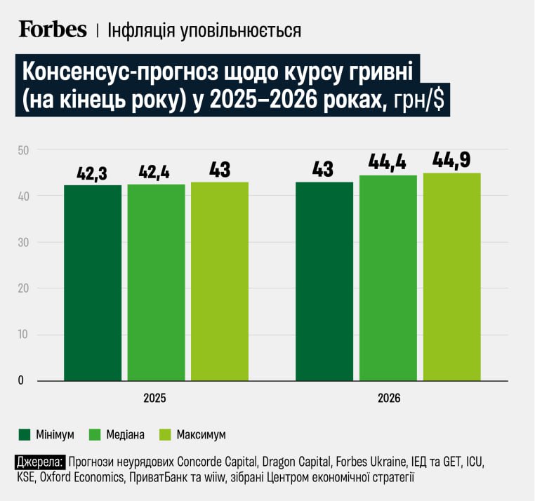 Forbes: гривня залишиться стабільною — курс 42,4 грн/$ на кінець 2025-го і 44,4 грн/$ на 2026-й за прогнозом Центру економічної стратегії