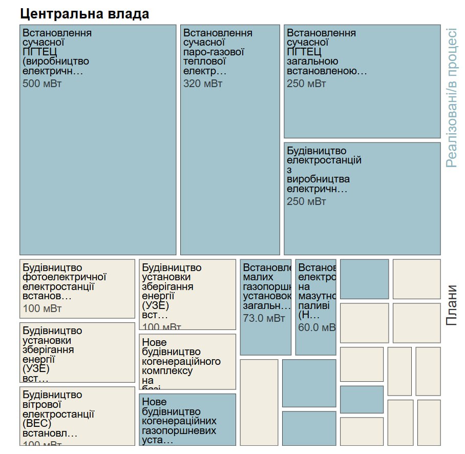 Порівняння структури інвестпроєктів у генерації вказує, що значна частина проектів центральної влади залишається нереалізованою або перебуває на стадії планування.