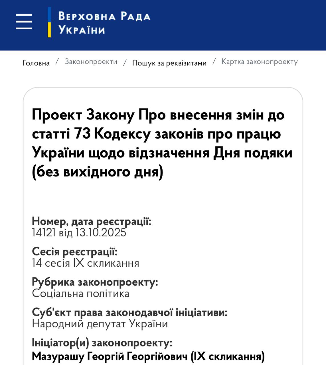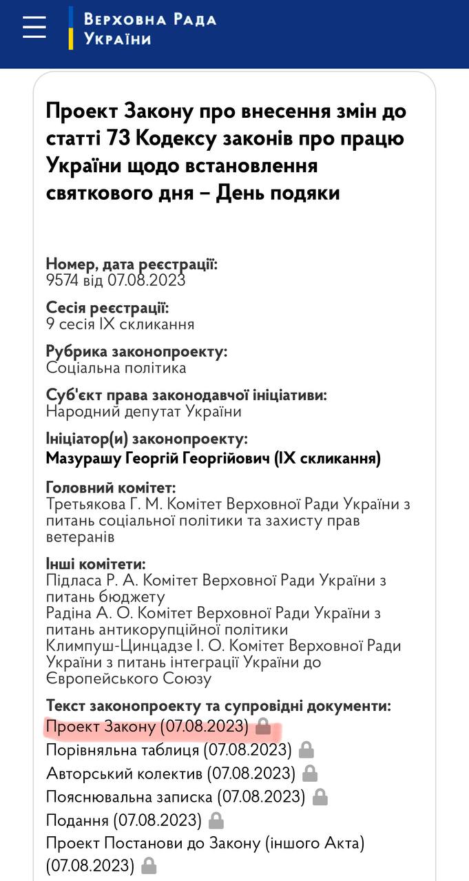 «Слуга» Мазураш пропонує запровадити в Україні американське свято «День подяки». Георгій Мазурашу зареєстрував в Раді відповідний законопроєкт, що передбачає зміни до статті 73 Кодексу законів про працю України. Документ належить до сфери соціальної політики та регламентує відзначення Дня подяки без додаткового дня відпочинку. Раніше, 7 серпня 2023 року, Мазурашу вже реєстрував схожий законопроєкт, однак його й досі не розглянула Верховна Рада. Раніше цей де нардеп пропонував розміщувати на банкнотах напис “Ми віримо в Бога”.