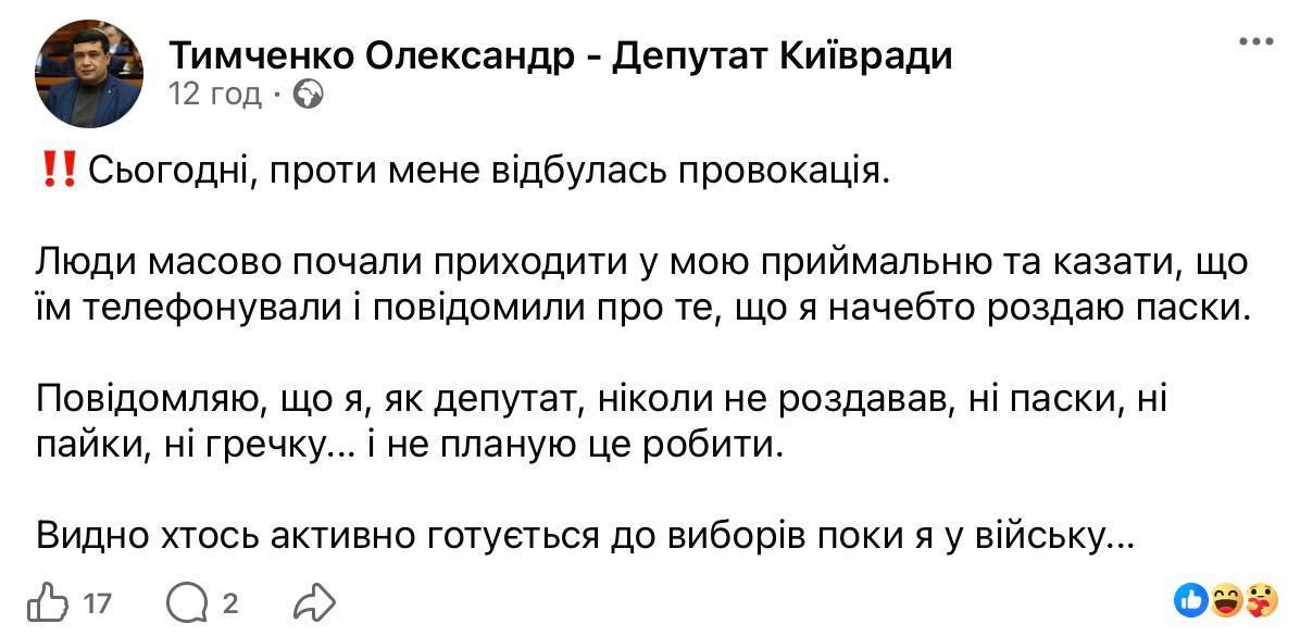Поки одні депутати Київради піаряться на роздачі пасок, інший — Олександр Тимченко — скаржиться, що проти нього влаштували провокацію, сказавши людям, що він також їх роздає