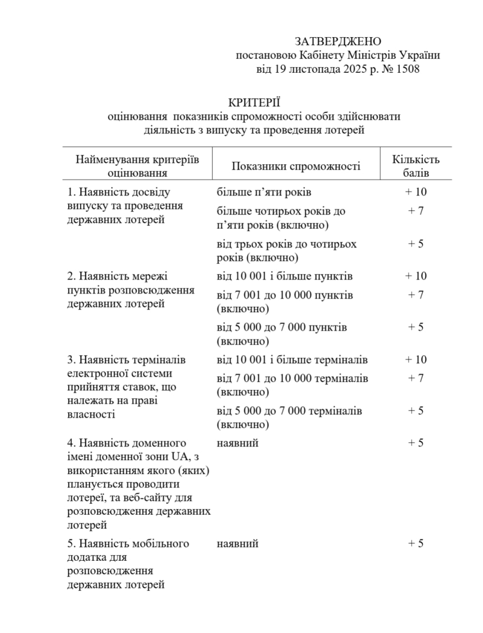 Кабмін ухвалив постанову №1508, якою вперше затвердив ліцензійні умови та порядок проведення конкурсу на отримання ліцензій державних лотерей. У документі визначені процедури, строки та вимоги до учасників.