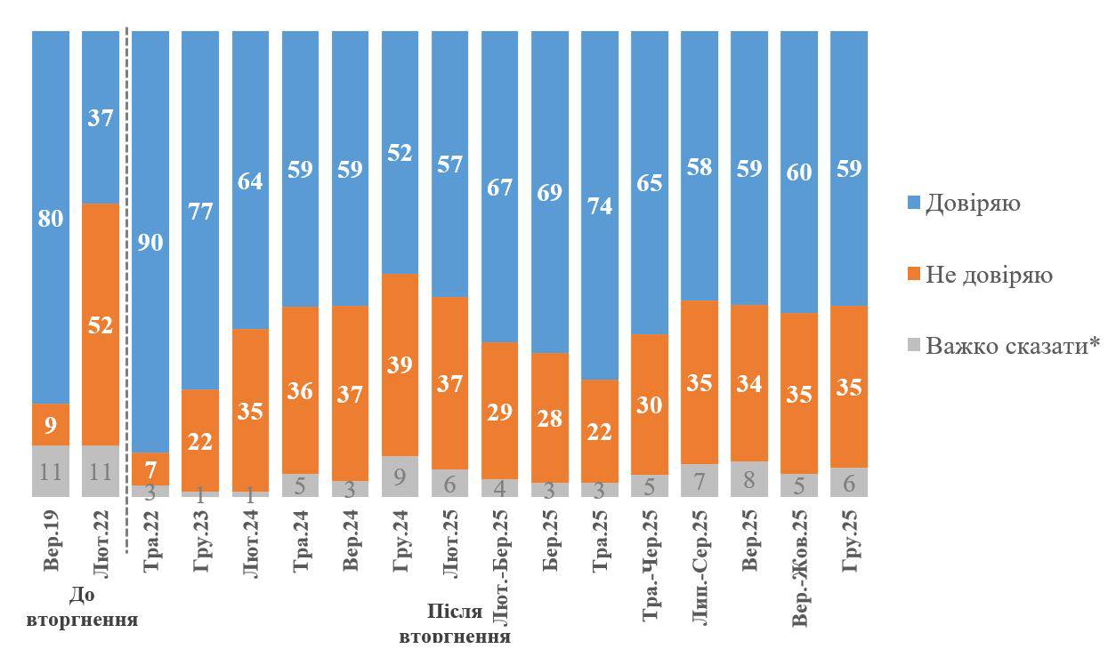 Баланс довіри-недовіри становить +24%. Однак соціологи зазначаю, що показник довіри є дуже динамічним. Так, серед респондентів, опитаних в листопаді (26-30 листопада), лише 49% довіряли Зеленському, а серед респондентів, опитаних у першій половині грудня (1-13 грудня) – 63%. Водночас серед респондентів, опитаних у другій половині грудня (14-29 грудня), вже 55% висловили довіру президенту. Тому в цілому можна бачити, що Президент втратив близько 10 процентних пунктів довіри після оприлюднення інформації про корупцію в енергетиці, але далі на тлі міжнародної ситуації (перемовин щодо миру) ми бачимо черговий раунд «згуртування навколо прапора» і посилення довіри. Проте на кінець грудня сила такого «згуртування» дещо ослабла і скоріше була тенденція до незначного, але зниження довіри.