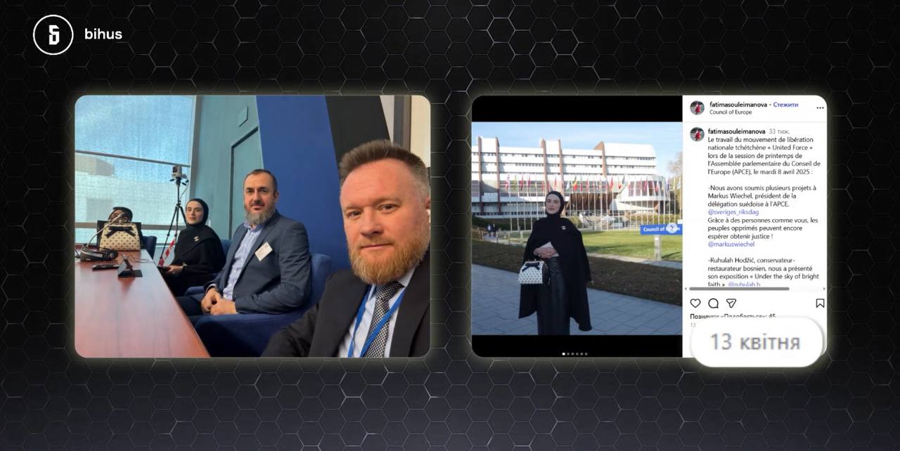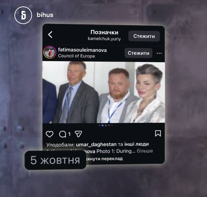 Також на фото поряд із Камельчуком Фатіма Сулейманова – чеченська активістка, яка дійсно була в Страсбурзі тоді ж, коли і Камельчук, у такому самому одязі, як на фото, щоправда – у квітні. Крім того, попри те, що вона активно веде соцмережі, чомусь там немає жодної згадки про Демократичний форум, у якому, вони нібито брали участь з Камельчуком в листопаді.