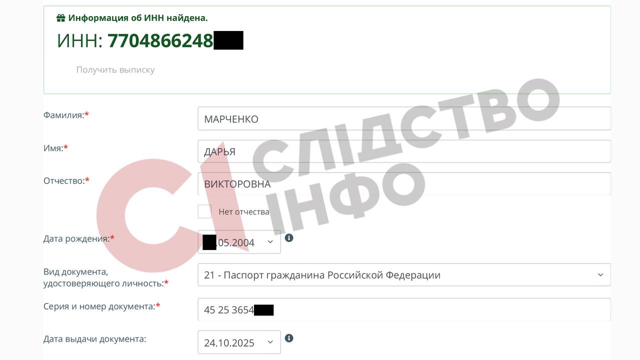 21-річна Дарья Медведчук 24 жовтня 2025 року отримала російський паспорт у Головному управлінні Міністерства внутрішніх справ у Москві. В документі вказане прізвище не батька, а матері: Марченко.