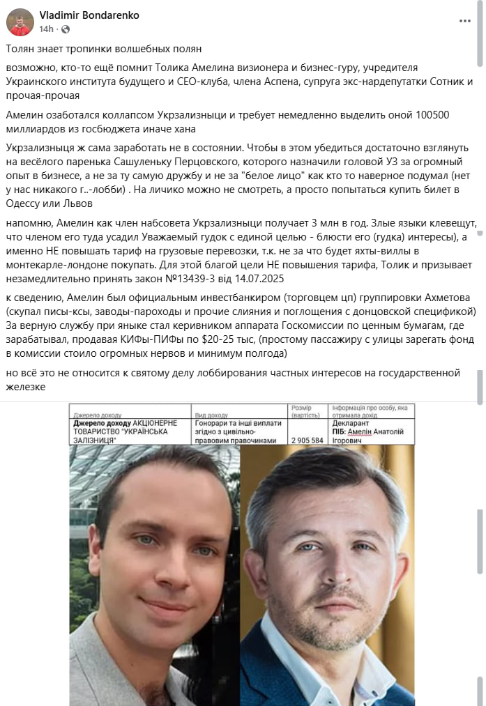 ️Співзасновник та директор економічних програм Ukrainian Institute for the Future Анатолій Амелін, який просуває інтереси Рината Ахметова, у коментарі NV Томаша Фіали звернув увагу на різницю між підходом до ФОПів та резидентів Дія.City. Він заявив: “Якщо ФОП з доходом мільйон на рік — це податкова лазівка, яку треба закрити, то чому резидент Дія.City зі ста мільйонами і всього 5% податку на виведений капітал — ні?”.