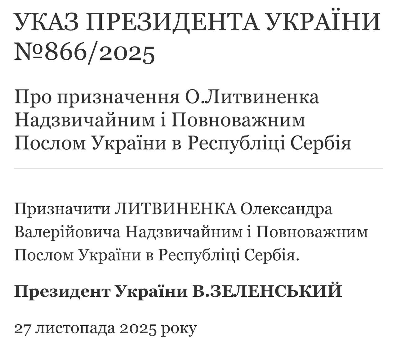 Екссекретаря РНБО Литвиненка призначено послом України в Сербії