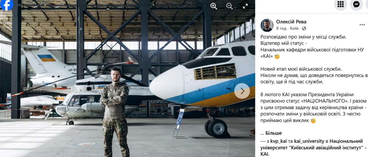 Начальником кафедри військової підготовки НУ «КАІ» (Київський авіаційний інститут) став колишній актор та сценарист «Мамахохатала» Олексій Рева
