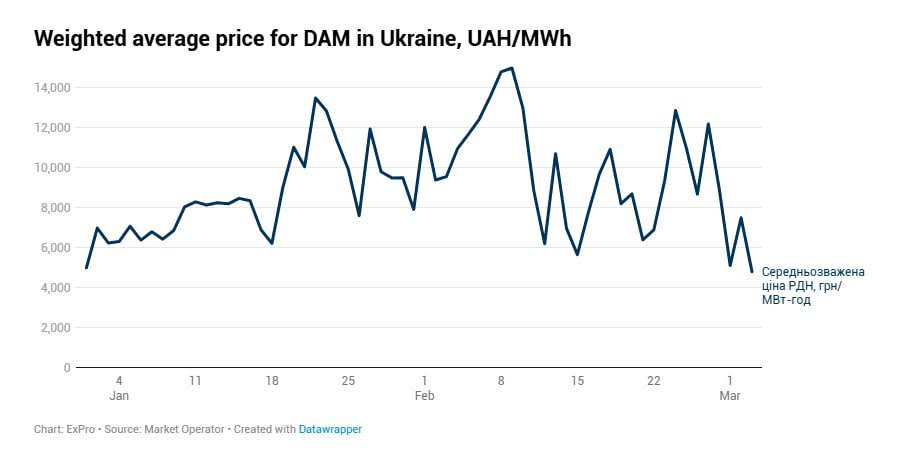 За результатами торгів на 3 березня 2026 року ціна на ринку “на добу наперед” в ОЕС України становила 4 816 грн/МВт·год. Це на 35% менше, ніж попередньої доби, і найнижчий показник із 26 грудня.
