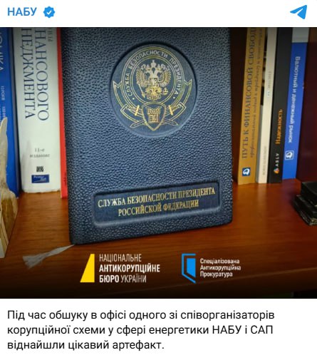 ️️НАБУ показало “артефакт”, знайдений під час обшуків у справі енергетичної корупції ️Національне антикорупційне бюро повідомило, що під час обшуку в офісі одного зі співорганізаторів корупційної схеми у сфері енергетики детективи НАБУ та прокурори САП виявили незвичний предмет. На фото, оприлюдненому відомством, видно папку з написом “Служба безопасности президента Российской Федерации”. ️Контекст:Обшуки проводяться в межах спецоперації "Мідас", яка стосується масштабних зловживань у державній компанії “Енергоатом”.