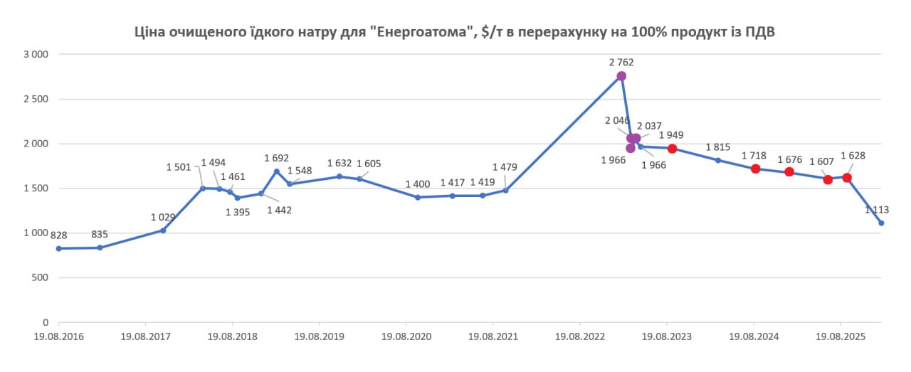 Ціна становить 48 000 грн за тонну, або близько $1113 у перерахунку на 100% основної речовини. Раніше у 2025 році “Енергоатом” закуповував їдкий натр за ціною $1600–1700 за тонну.