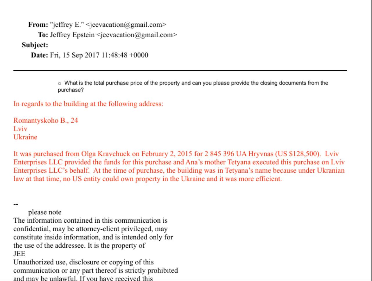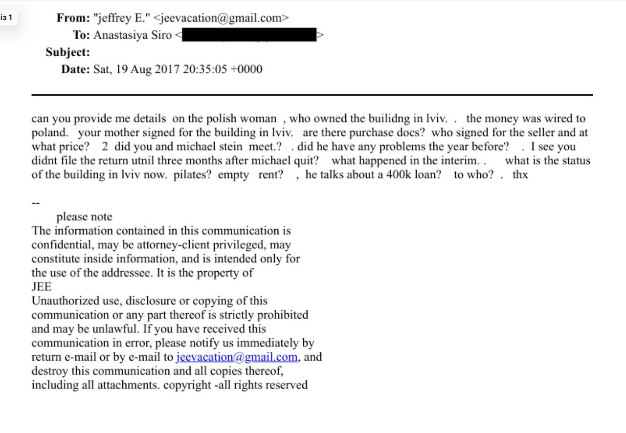 В опублікованих файлах є переписка Епштейна з українкою Анастасією Сіро, з якою він обговорював різні інвестицій.В одному з листів мільярдер запитує про невідому польку, якій належав будинок у Львові. Як зрозуміло з повідомлення, мати Анастасії Сіро придбала цю нерухомість і переказала кошти на польські рахунки. Ймовірно, йшлося про будівлю за адресою вул. Бориса Романицького, 24, адже далі Епштейн писав про придбання її матір’ю Анастасії Тетяною через Lviv Enterprises LLC за понад $128 тис.