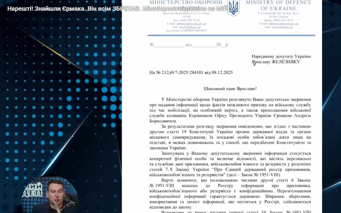 Нардеп Ярослав Железняк заявив у YouTube: “Ми отримали відповіді на всі запитання”. Він додав: “Якщо ви хочете дізнатись де служить Єрмак — він не на фронті”.