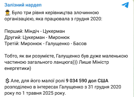 Нардеп Ярослав Железняк написав у Telegram: “Було три рівня керівництва злочинною організацією, яка працювала з грудня 2020: Перший: Міндіч – Цукерман Другий: Цукерман – Миронюк Третій: Миронюк – Галущенко – Басов”.