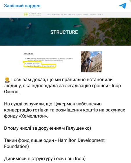 ️️Железняк заявив, що “людина, яка відповідала за легалізацію грошей — Івор Омсон”, та послався на структуру Hamilton Development Foundation, озвучену під час суду щодо запобіжного заходу Герману Галущенку