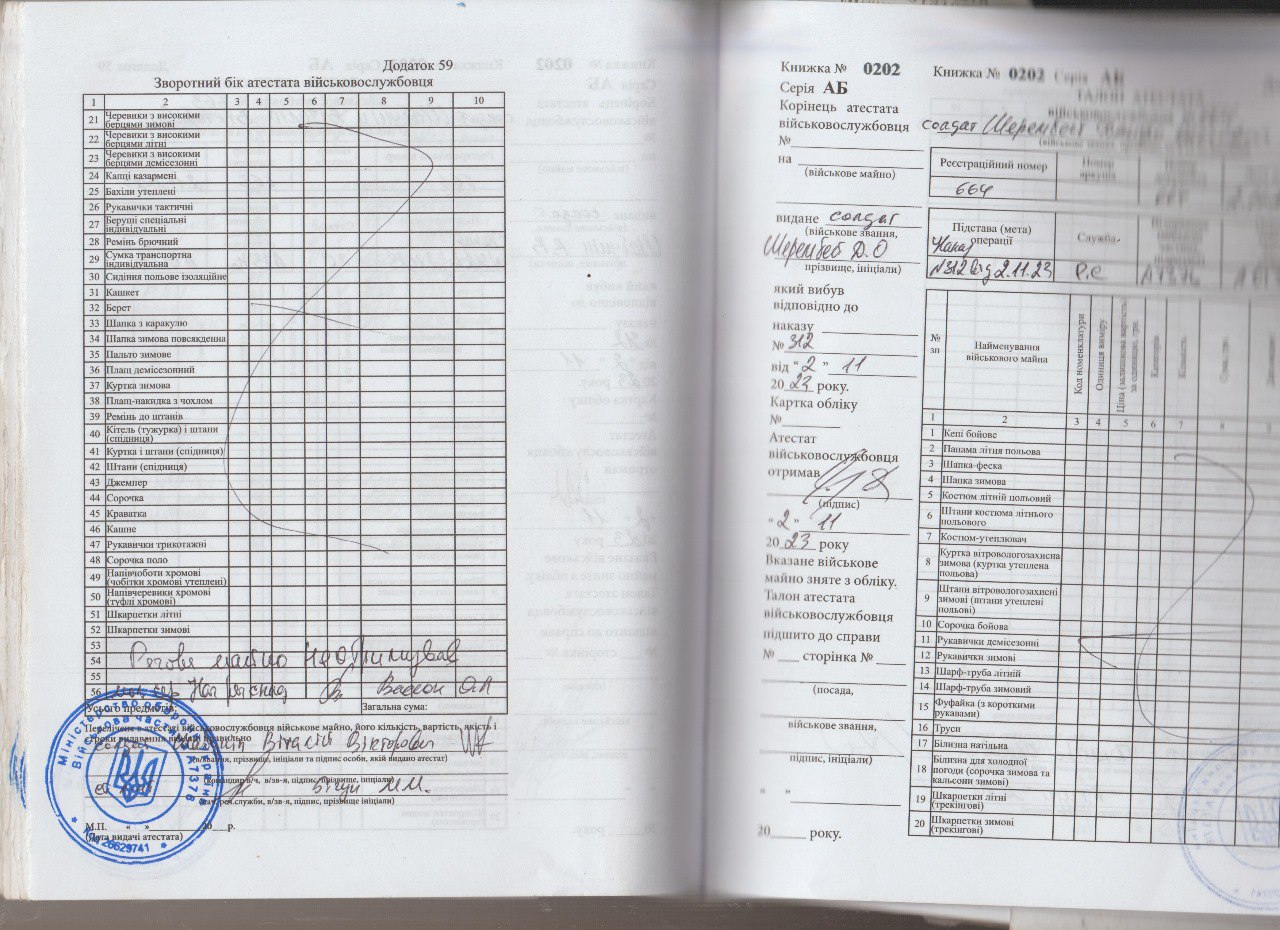 Він опублікував речові атестати солдатів Шабуніна та Шерембея, які їм видали у 2023 році при переведенні з 207 окремого батальйону Тр О в 101 окрему бригаду охорони Генштабу ЗСУ.